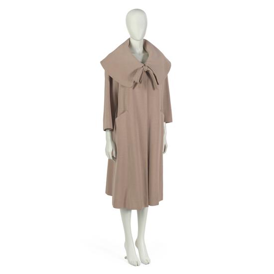 Hostess ensemble comprising ivory silk taffeta dress and black velvet cutaway coat