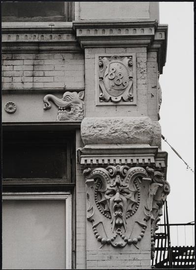 [Decorative clock on the side of an unidentified building, possibly a bank.]