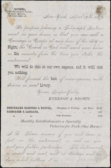 [Ryerson & Brown proposal to put a telegraph instrument in customers' houses.]