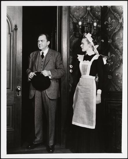 [René Ray as Sheila Birling and John Buckmaster as Gerald Croft in "An Inspector Calls".]