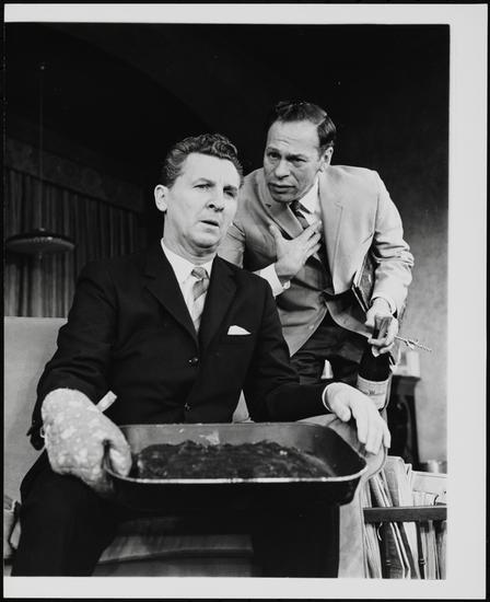 [Mike Kellin as Oscar Madison and Eddie Bracken as Felix Ungar in "The Odd Couple".]
