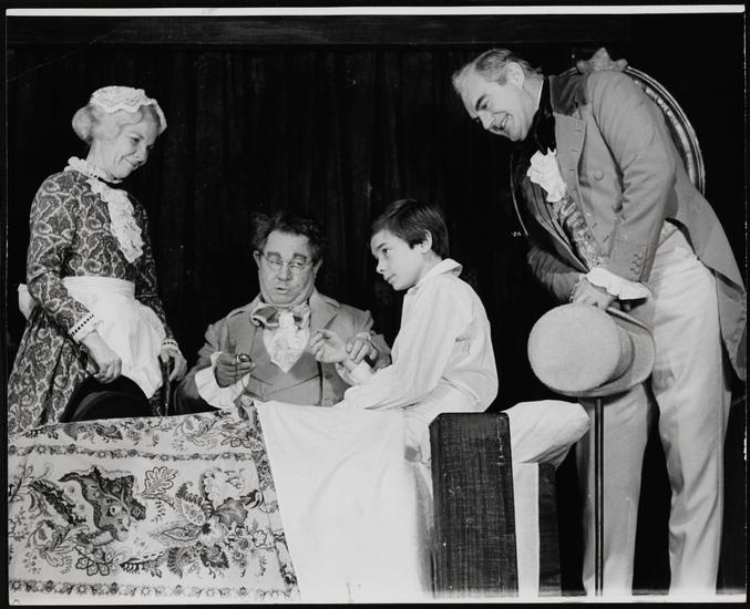 [Dortha Duckworth as Mrs. Bedwin, Bruce Prochnik as Oliver Twist and Geoffrey Lumb as Mr. Brownlow in "Oliver!".]