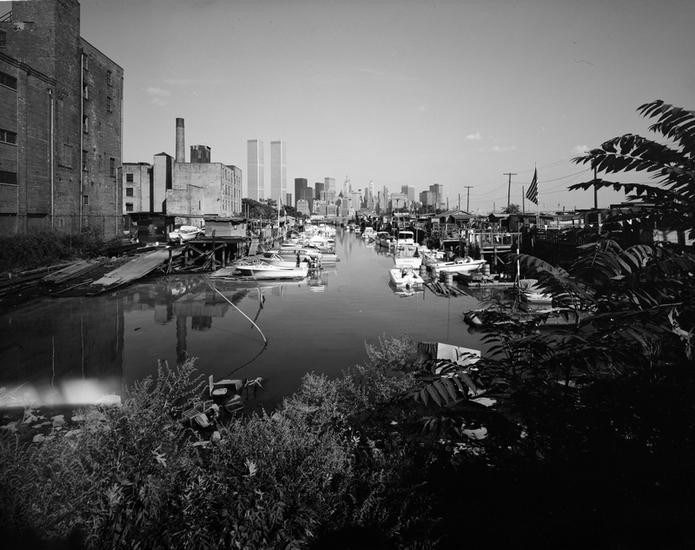 [Looking east from a deteriorated dock in New Jersey to the Lower Manhattan skyline.]