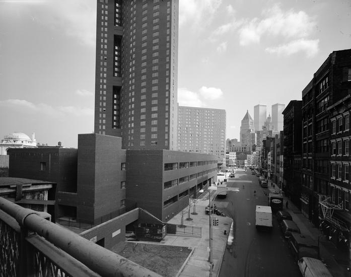 [Underneath the Manhattan Bridge overpass with a distant view of the World Trade Center and the Municipal Building.]