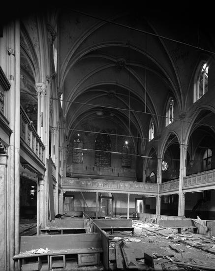 [Burnt-out remains of Congregation Makower of Polen, 203 Henry Street.]