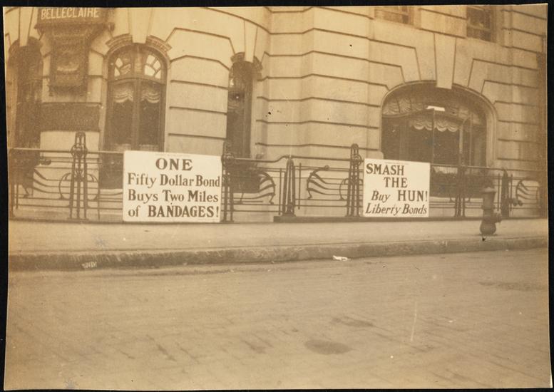 Street Scenes, etc. Showing Displays of Liberty Loan Posters during World War I [Liberty Loan posters at the Belleclaire Hotel.]