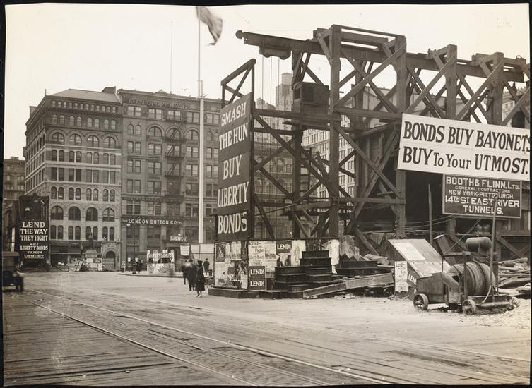 Street Scenes, etc. Showing Displays of Liberty Loan Posters during World War I [Liberty Loan signs on construction on University Place and 14th Street.]