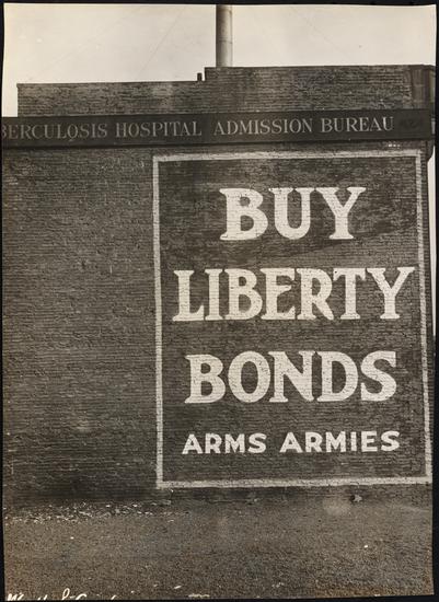 Street Scenes, etc. Showing Displays of Liberty Loan Posters during World War I [Liberty Loan painted advertisement.]