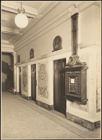 [Interior, elevator lobby with crown molding detail drawn in.]