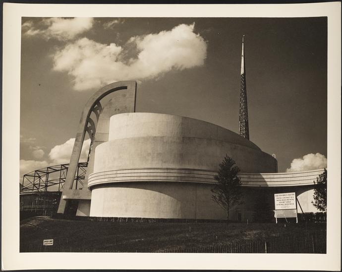 [Electrical Products building with the frame of the Trylon in the background, New York World's Fair site.]