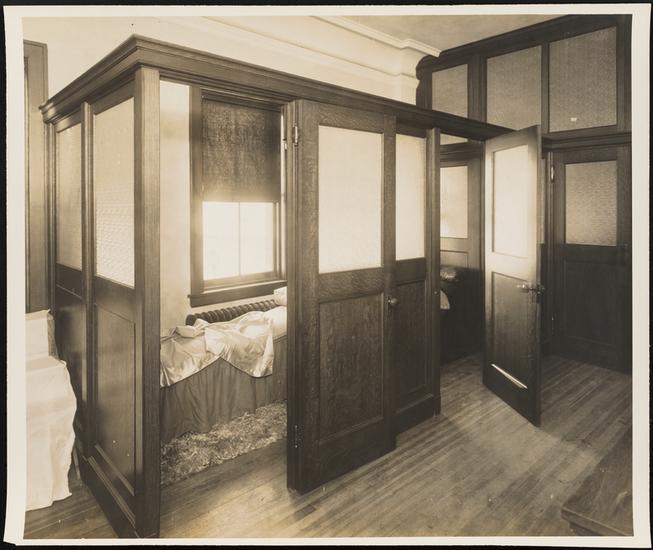 [Residence. Interior, bedroom. (Bed behind curtain).]