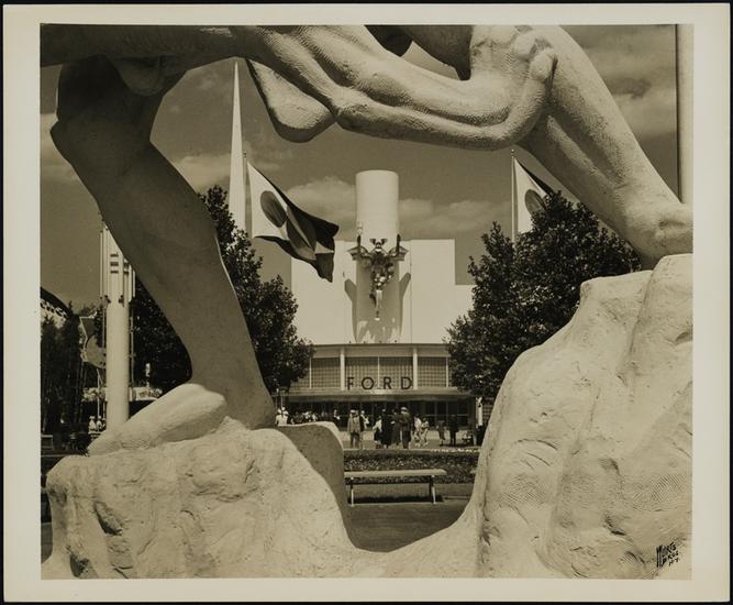 [Ford building seen through "Samson and the Lion" at the New York World's Fair.]