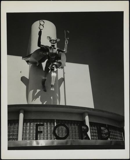 [Ford "Mercury" statue on facade of Ford building, New York World's Fair.]