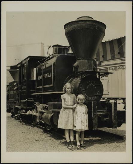 [Two girls standing in front of Minnetonka railroad, New York World's Fair.]