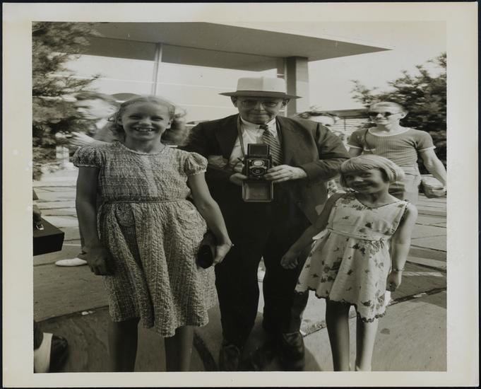 [New York World's Fair. Amusement area, Wurts family in funhouse mirror.]