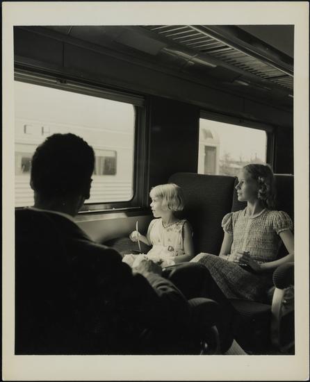 [Two girls inside train car, New York World's Fair.]