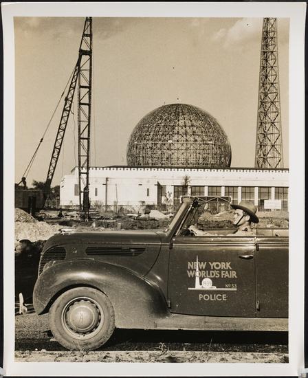 [New York World's Fair. Motor police officer in front of New York City Building. Construction view. (With the Trylon and Perisphere in the background.).]