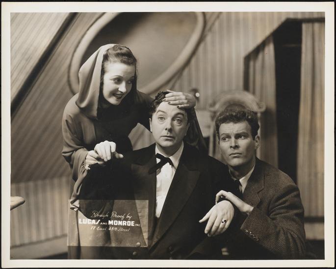 [Marta Eggert as Minnie Sorenson, Jack Haley as Zachary Ash, and Shirley Ross as Sandy Moore in "Higher and Higher".]