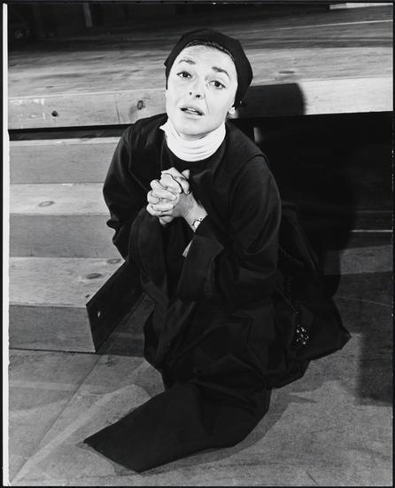 [Anne Bancroft as Sister Jean of the Angels and John Colicos as De Laubardemont during rehearsals for "The Devils".]