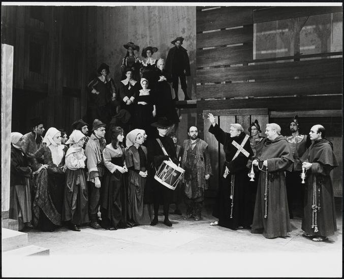 [Hugh Franklin as Jean D'Armagnac with others in "The Devils".]