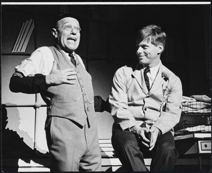 [Robert Morse as J. Pierrepont Finch and Rudy Vallee as J. B. Biggley in "How to Succeed in Business Without Really Trying".]