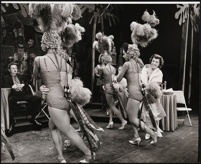 [Phil Silvers as Hubert Cram and Nancy Walker as Kay Cram with chorus girls in "Do Re Mi".]