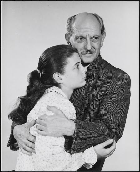[Joseph Schildkraut as Otto Frank, Jack Gilford as Mr. Dussel and Dina Doronne as Anne Frank in "The Diary of Anne Frank".]