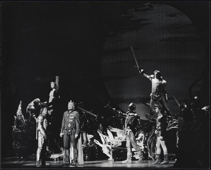 [Meg Bussert as Guenevere, Richard Harris as Arthur, and Richard Muenz as Lancelot Du Lac in "Camelot".]