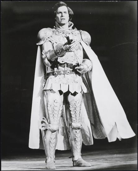[Richard Muenz as Lancelot Du Lac and Meg Bussert as Guenevere in "Camelot".]