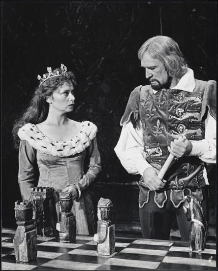 [Richard Harris as Arthur and Meg Bussert as Guenevere in "Camelot".]