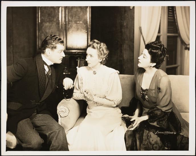 [Karen Morley as Thea Elvsted, Katina Paxinou as Hedda Tesman, and Henry Daniell as Eilert Lovborg in "Hedda Gabler".]