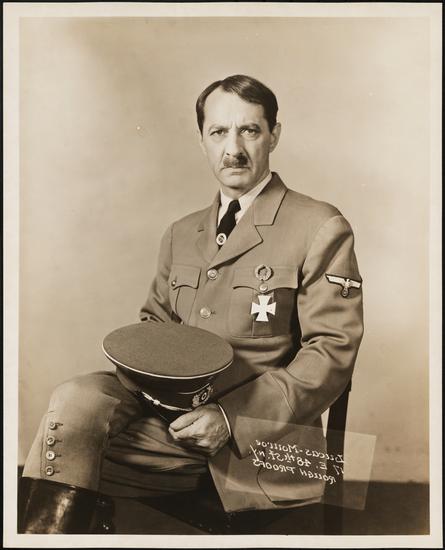 [Arthur Winton as General Von Bruck, Harry Green as Avrum Dovid and Brandon Peters as Adolf Hitler in "The Day Will Come".]