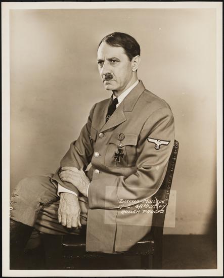 [Arthur Winton as General Von Bruck, Harry Green as Avrum Dovid and Brandon Peters as Adolf Hitler in "The Day Will Come".]