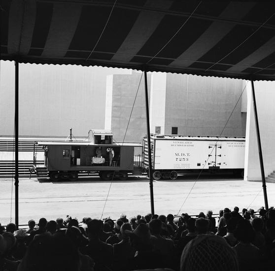 [People watching South Carolina Railroad display at the New York World's Fair.]