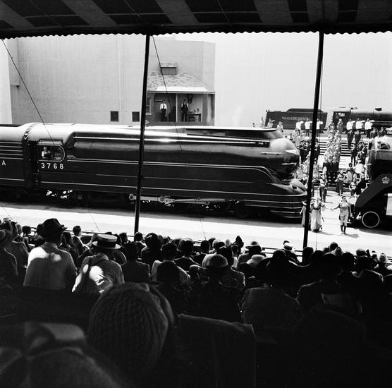 [People gathered around train on display at the New York World's Fair.]