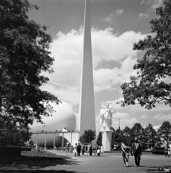 [New York World's Fair grounds, with the Trylon and Perisphere in the background.]