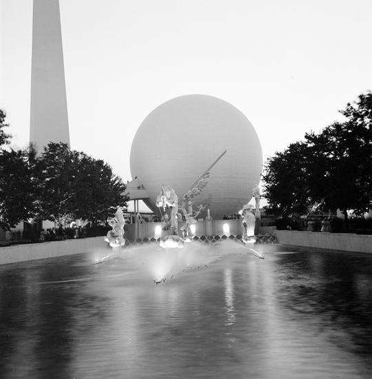 [Grounds of the New York World's Fair, with the Trylon and Perisphere visible.]