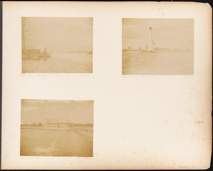 [Harbor, unidentified building from a park; shore of an unidentified lake.]