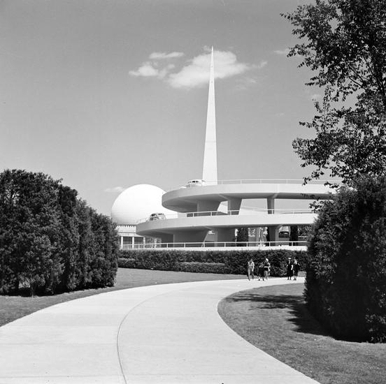 [Spiral driveway of the Ford pavilion, with the Trylon and Perisphere in the background, New York World's Fair.]