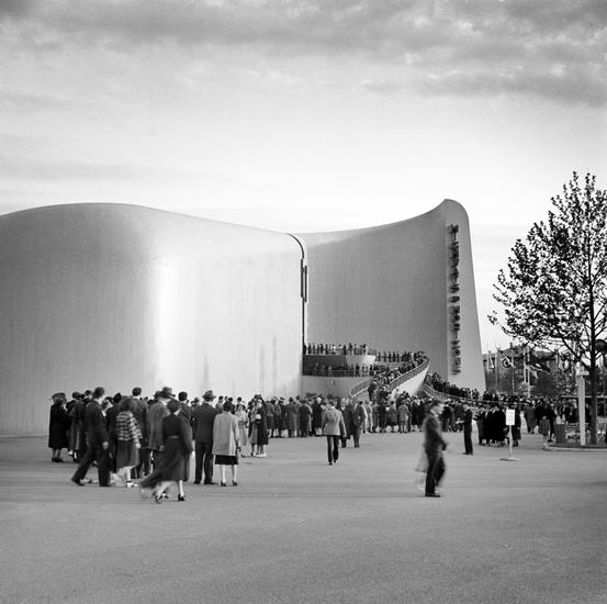[General Motors building at New York World's Fair, with people waiting in line for the Futurama ride.]