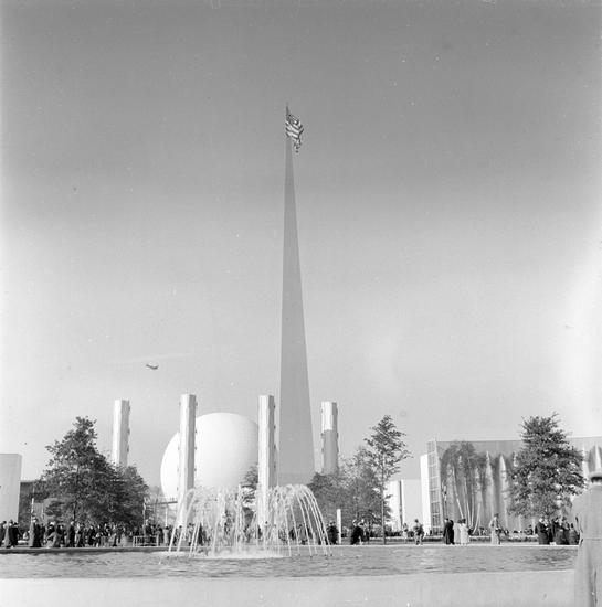 [Grounds of the New York World's Fair, with the Trylon and Perisphere visible.]