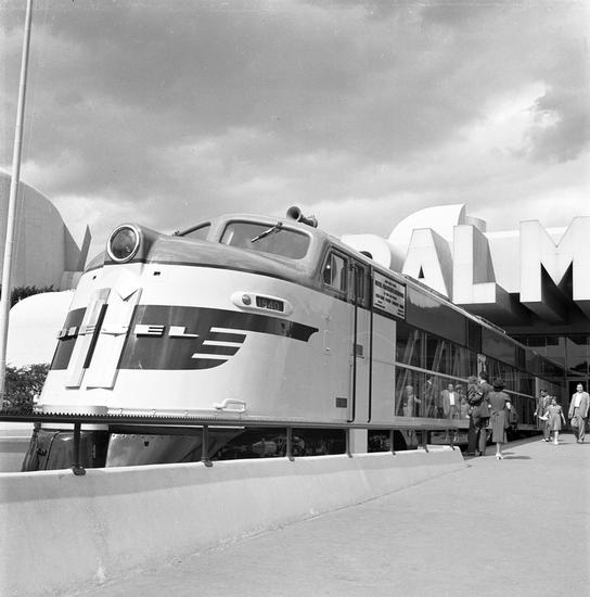 [Diesel passenger locomotive in front of the General Motors building at the New York World's Fair.]