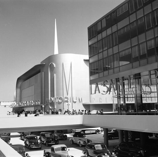 [People walking by GM's Preview of Progress Auditorium at the New York World's Fair, with the Perisphere and Trylon in the background.]
