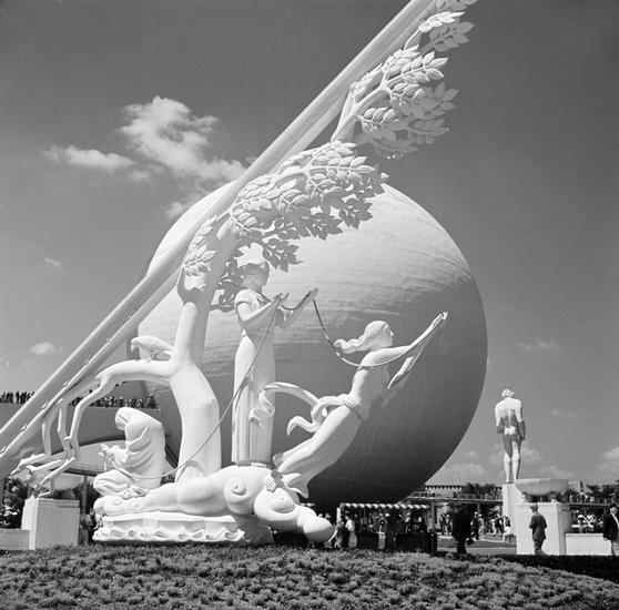 ["Times and the Fates of Man" in front of the Perisphere, Theme Center, New York World's Fair.]