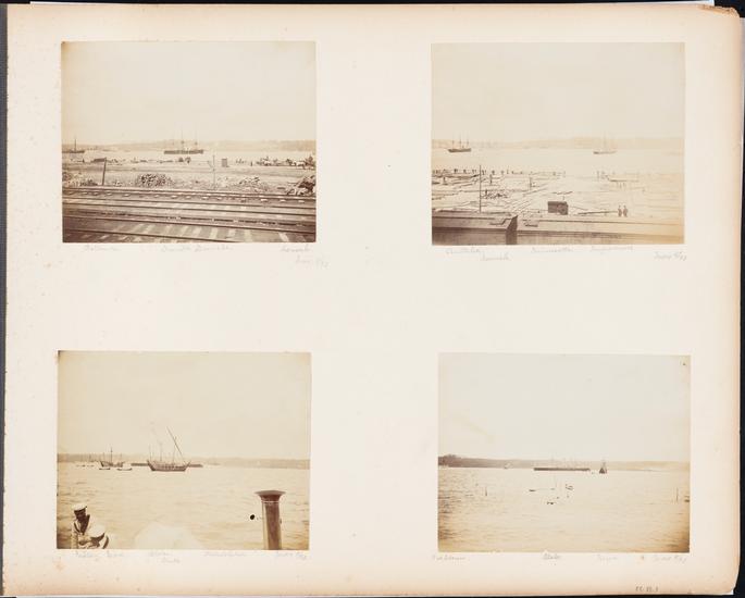 [Harbor, unidentified building from a park; shore of an unidentified lake.]
