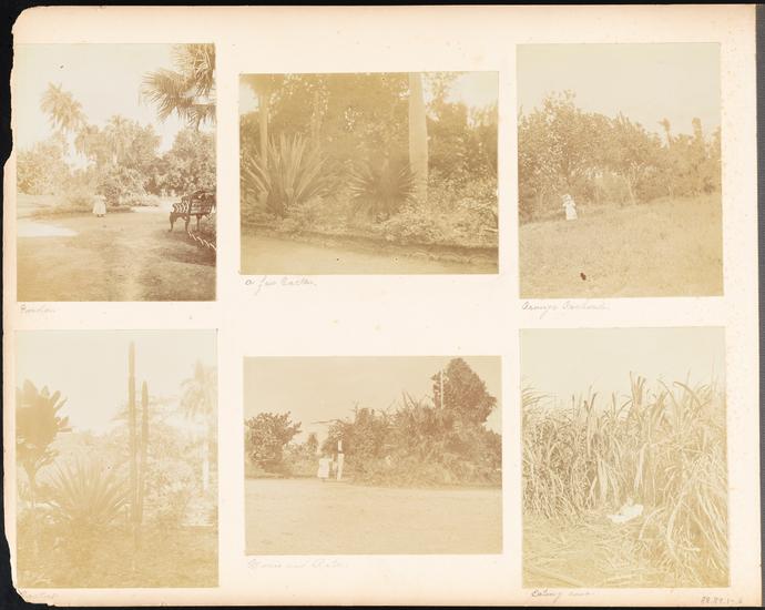 A cane wagon; A bit of the front of ["Barviacon"?]; French piazza, [Dwelling?] House; Cane cars discharging at ["trapiche"?]; South side of "Casa Molienda"