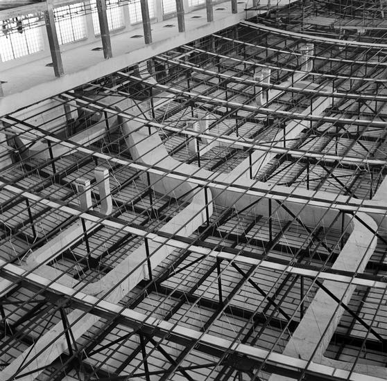 [New York World's Fair. Construction view, looking up at steel frame.]