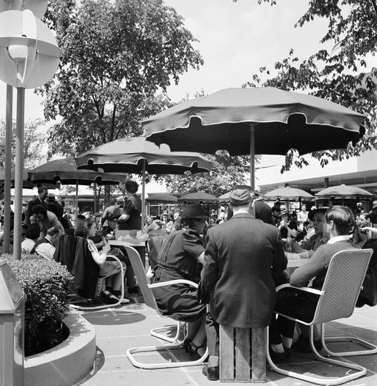 [People at an outdoor cafe, Venezuelan pavilion, New York World's Fair.]