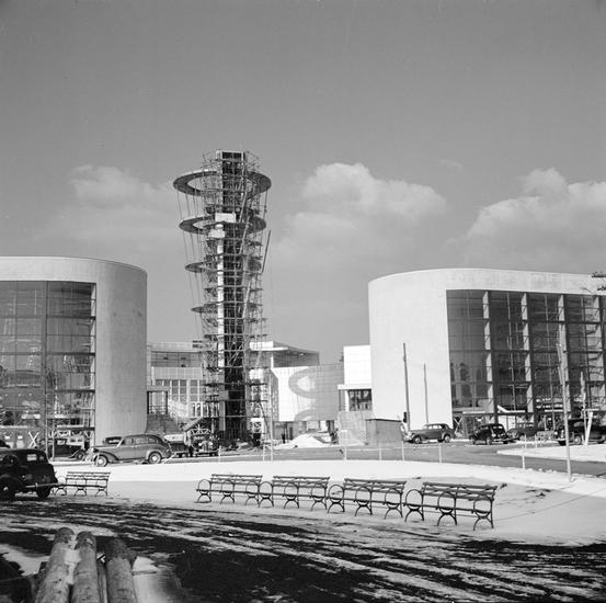 [Construction at the New York World's Fair site, showing Trylon and Perisphere.]