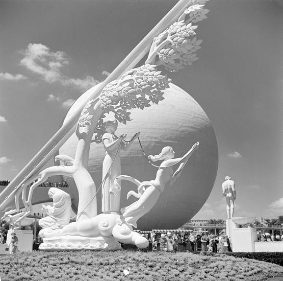 New York Worlds Fair. Theme center, "Astronomer" sculpture [Showing the Perisphere.]